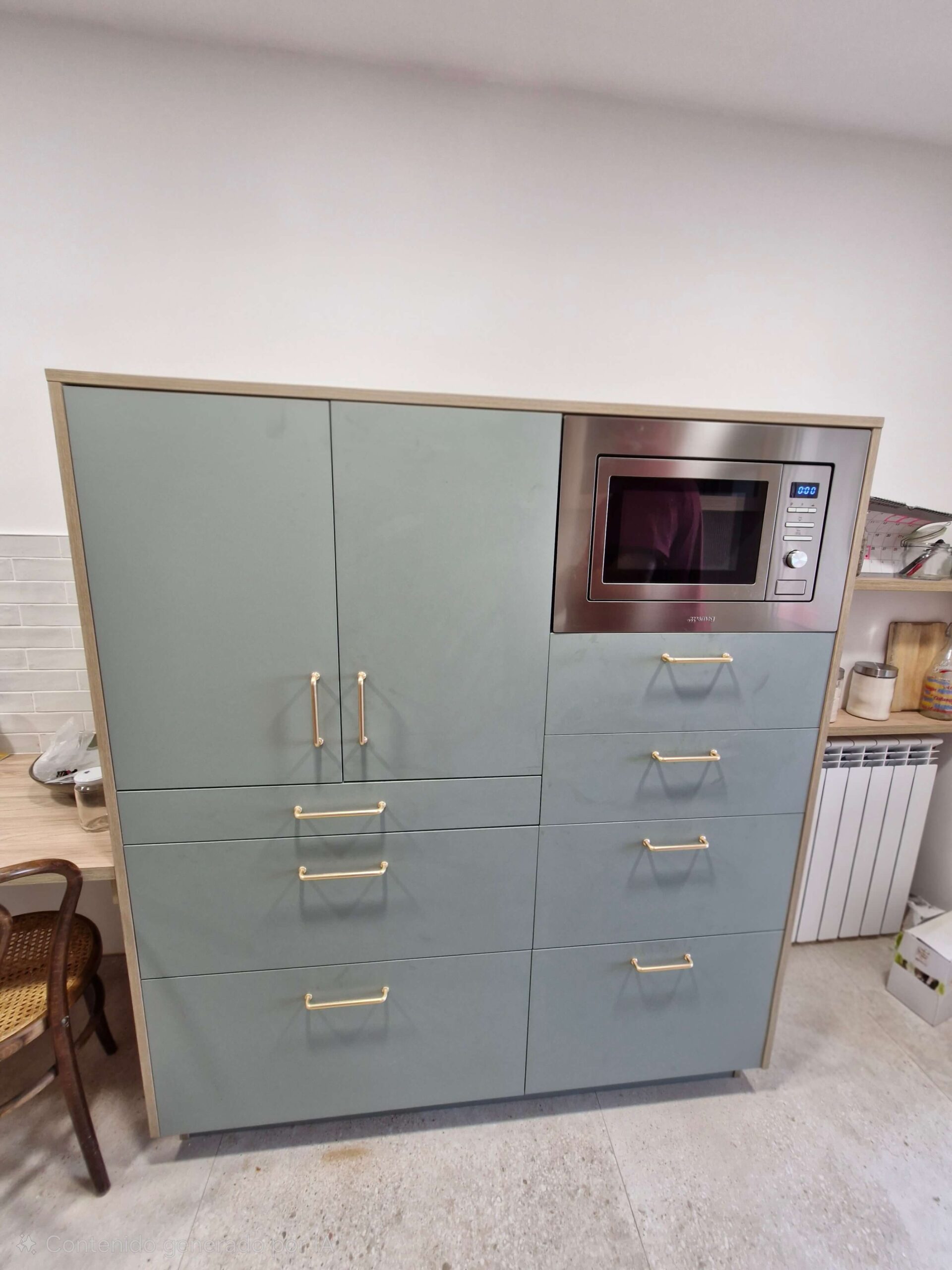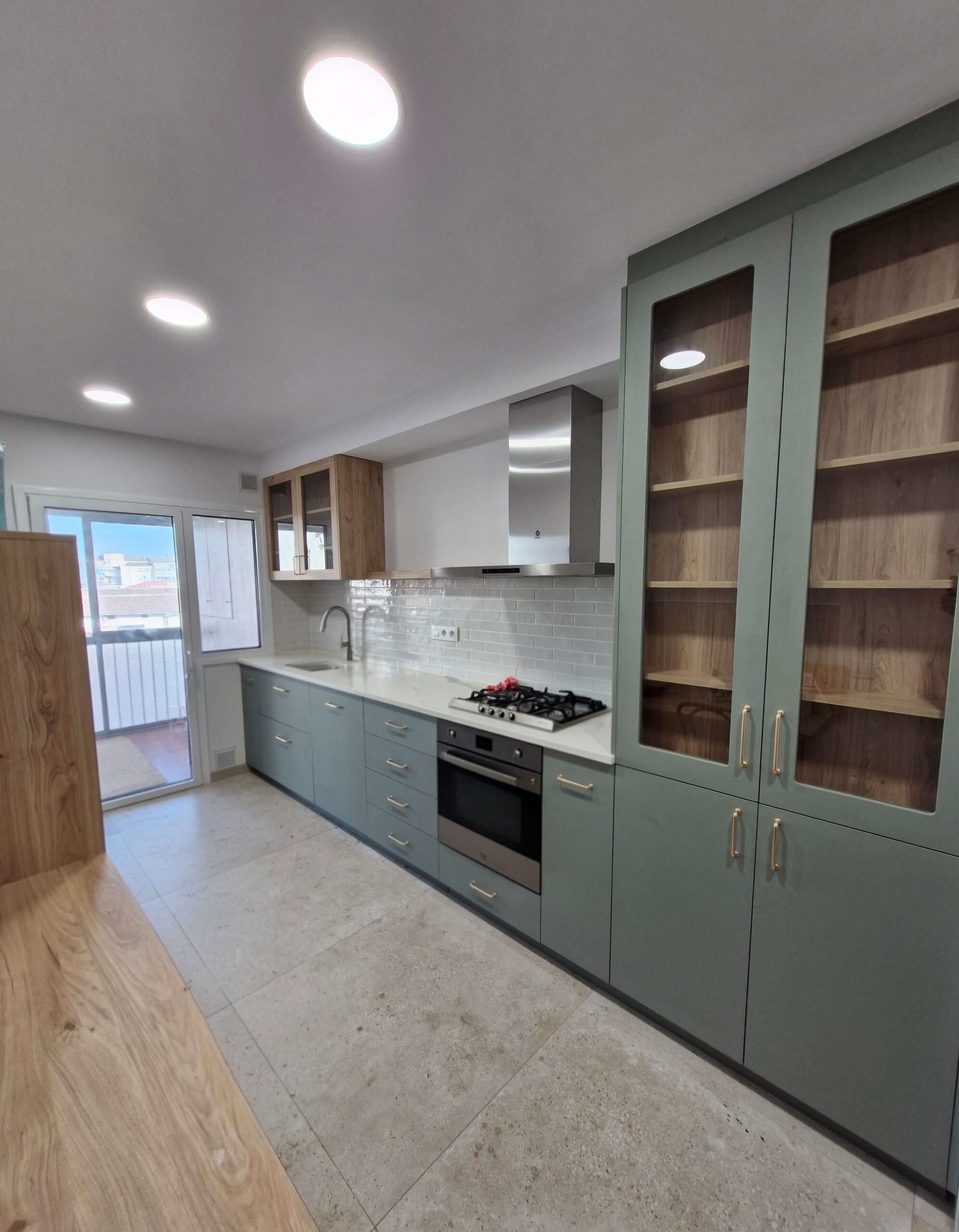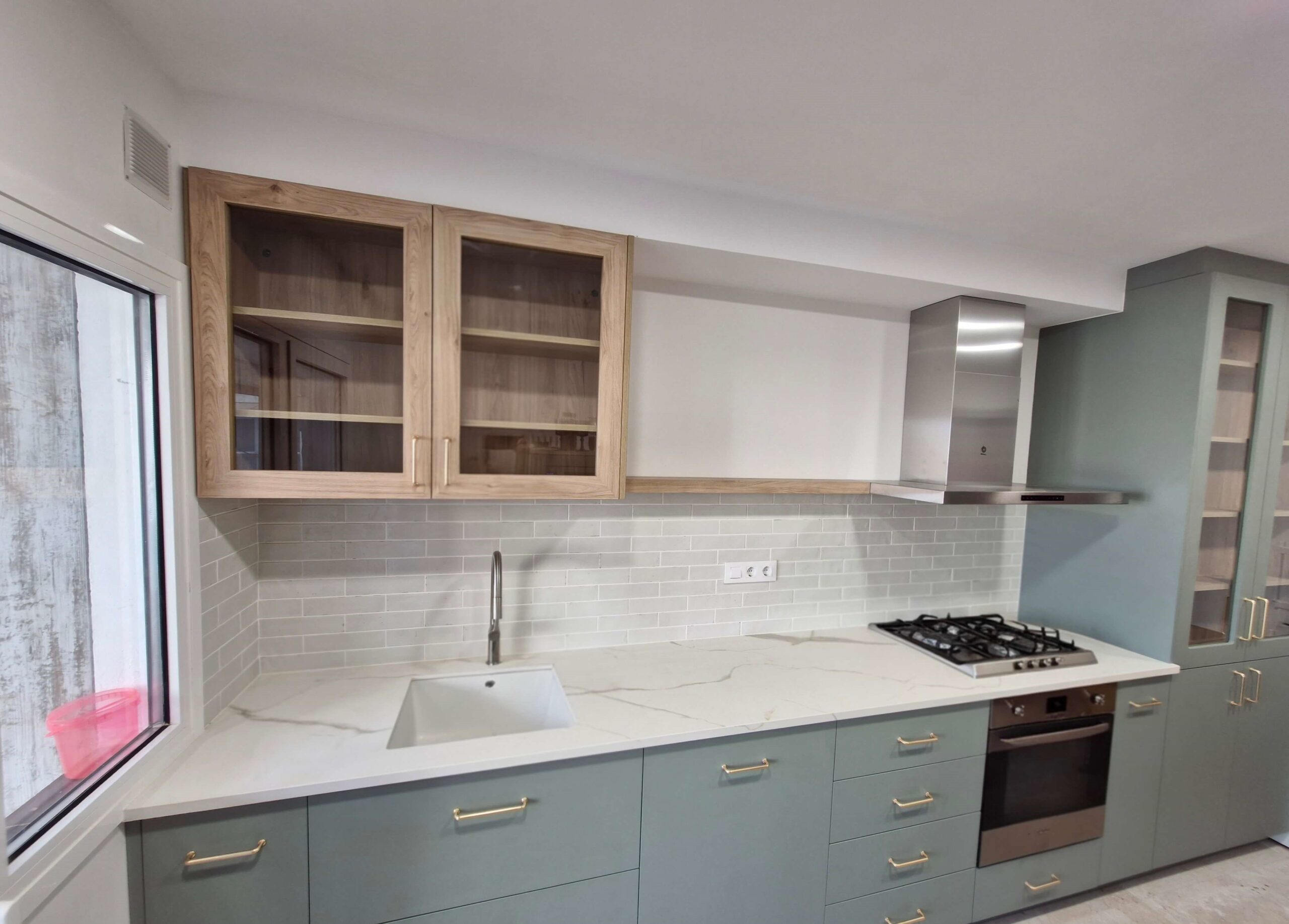 Una combinació de colors que aporta calma: verd, fusta i el toc elegant dels tiradors en or. Les vitrines fan que la cuina es senti més oberta i neta a la vista, deixant que la fusta de l’interior aporti calidesa a tota la cuina de manera natural.